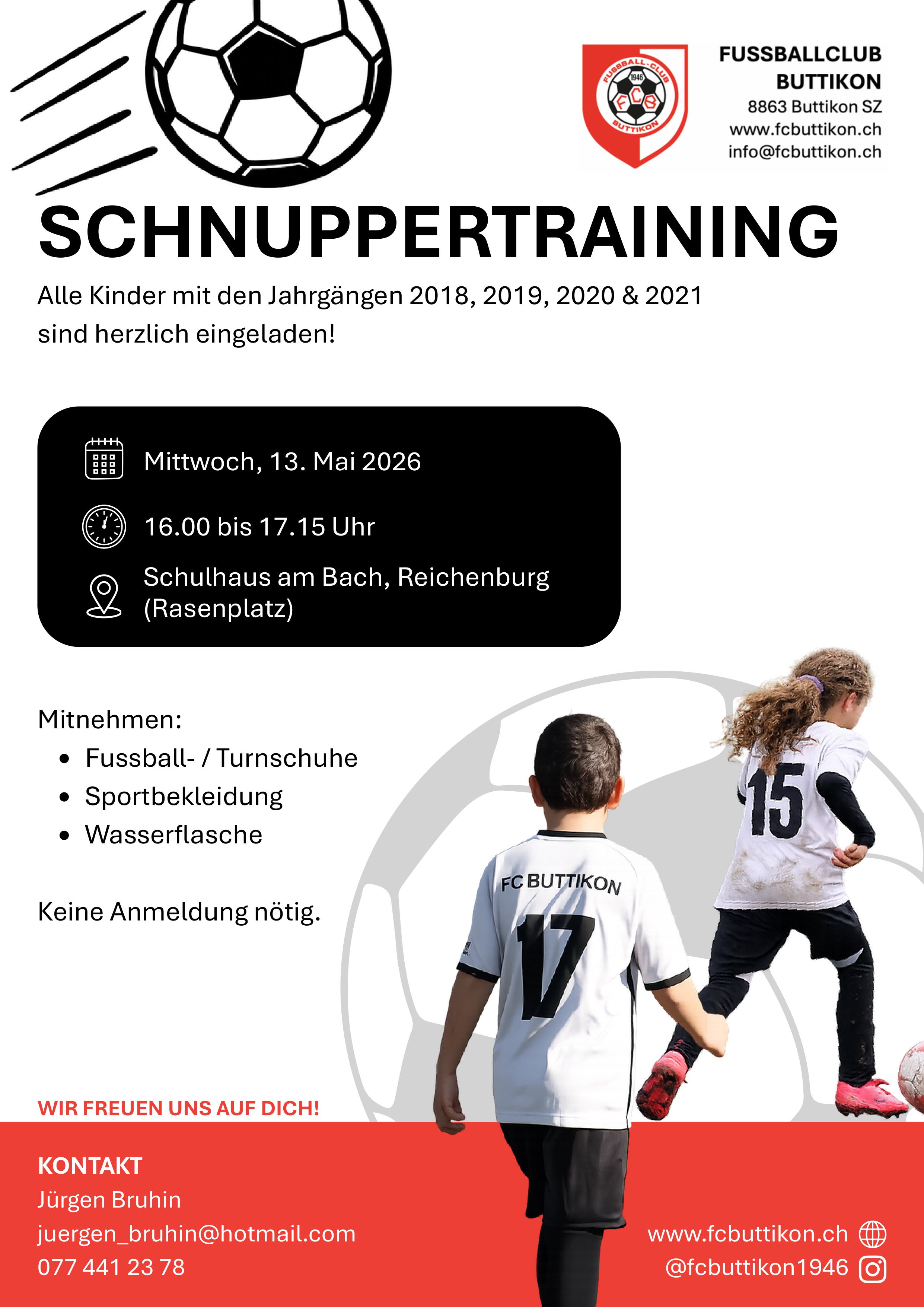 Der FC Buttikon lädt alle fussballbegeisterten Kinder der Jahrgänge 2018–2021 herzlich zum Schnuppertraining am 13. Mai 2026 in Reichenburg ein.
