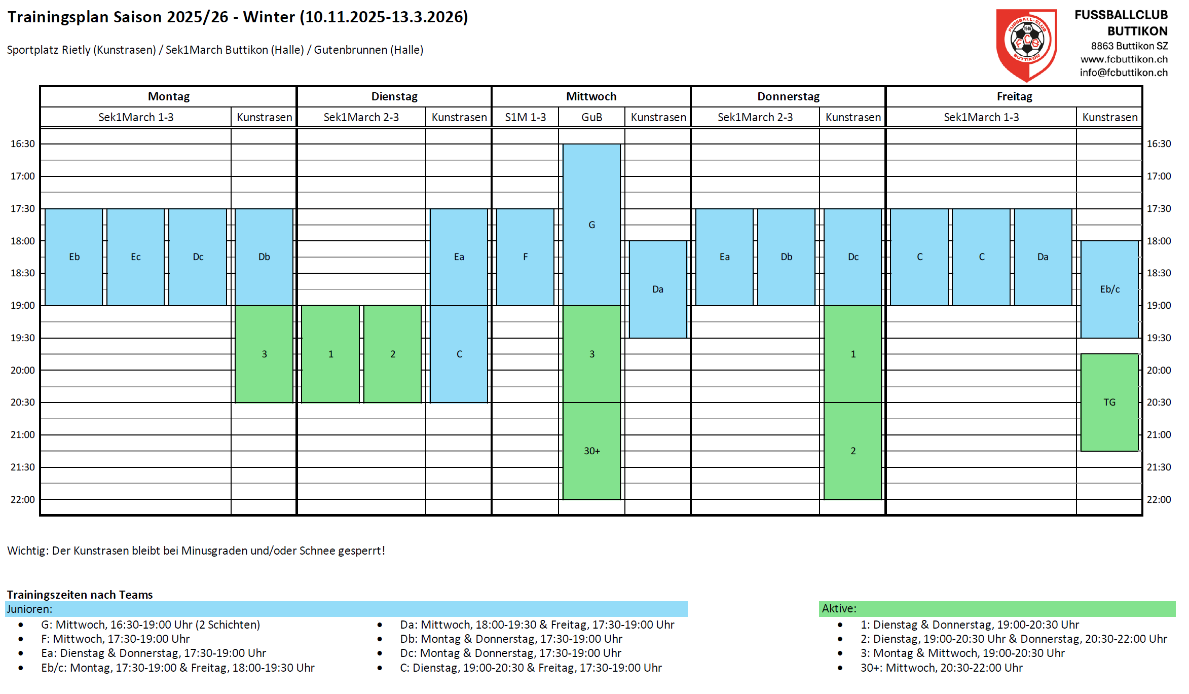 Trainingsplan Trainingsplan Schönwetter Saison 2025/26: Schlechtwetter Saison 2025/26: Winter Saison 2025/26: Belegungsplan Gutenbrunnen » Trainingsplan Saison 2025/2026 (pdf) » Trainingsplan Hallentraining Winter 25/26 (pdf) »